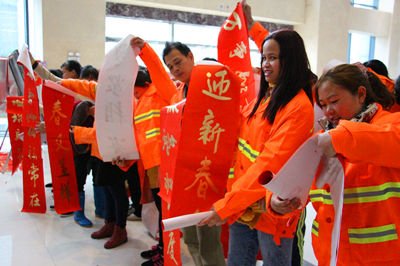 “春滿人間百花吐艷 福臨小院四季常安” “一帆風(fēng)順年年好 萬事如意步步高” ……1月26日至28日,麗匯大廈一樓熱鬧非凡,為了感激社會各界對綠港集團(tuán)的關(guān)心與支持,由綠港集團(tuán)工會組織的書法家“迎新春 送祝福”義務(wù)送春聯(lián)活動吸引了大量前來求墨寶的社會各界人士。三位南寧市書法協(xié)會的書法家以及南寧科巨公司副總經(jīng)理陸章發(fā)為觀眾們現(xiàn)場揮毫,一幅幅金燙燙、散發(fā)著墨香的春聯(lián)映襯著人們的笑臉,整個(gè)現(xiàn)場彌漫著濃濃的年味,短短三天時(shí)間便送出了2000多副春聯(lián)。1月26日上午,綠港集團(tuán)工會還啟動了派送春聯(lián)儀式,綠港集團(tuán)工會主席黃麗琴帶領(lǐng)工會人員將春聯(lián)送到經(jīng)開區(qū)40余位保潔人員、園林綠化工人、公司職工的手上。(張彩秀/文、圖)